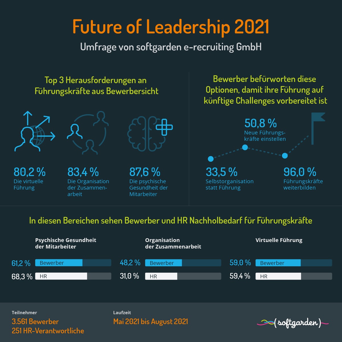 70 % der Bewerber gehen davon aus, dass sich die Führungspraxis in Unternehmen unter dem Einfluss der Pandemie grundsätzlich verändert. Für viele neue Herausforderungen sehen sie die aktuellen Führungskräfte als nur unzureichend vorbereitet an. Das ist das Ergebnis der softgarden-Studie "Future of Leadership". An der doppelperspektivischen Online-Umfrage haben von Mai bis August 2021 3.561 Bewerber sowie 251 HR-Verantwortliche teilgenommen.