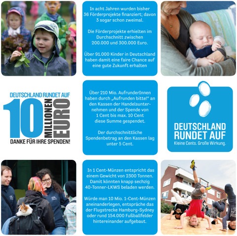 Vor acht Jahren entstand eine simple Idee: Spenden für jedermann möglich machen, ohne Aufwand, ohne finanzielle Belastung, nur ein paar Cents. So entstand die Spendenbewegung DEUTSCHLAND RUNDET AUF. Millionen Menschen machen mit und verwandeln Kleingeld in die Förderung für Kinder. In diesem Monat feiert die Stiftung DEUTSCHLAND RUNDET AUF einen gigantischen Meilenstein: 10 Millionen Euro wurden bisher gesammelt. Das heißt, knapp 210 Millionen Mal wurde an den Kassen deutscher Handelsunternehmen "Aufrunden bitte!" gesagt. "Wir freuen uns sehr über dieses großartige Spendenergebnis und noch was wir damit bewirken", sagt Anke Merz-Betz, Geschäftsführerin der Stiftung DEUTSCHLAND RUNDET AUF und ergänzt: "Wir haben über 91.000 Kindern und Jugendlichen in Deutschland durch die unterstützten Förderprojekte konkret geholfen, bessere Chancen in unserem Bildungs- und Gesellschaftssystem zu erhalten. Denn Bildung, soziale Kompetenz und die Erziehung zu eigenständigem Denken und Toleranz sind ein wesentlicher Erfolgsfaktor für deren und unser aller Zukunft."