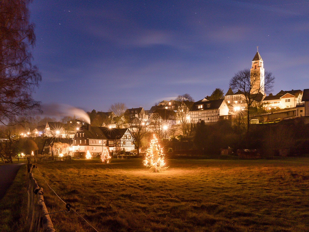 Wer noch mehr Licht in der Dunkelheit erleben möchte, sollte unbedingt den Weihnachtsbaumweg durch Schmallenberg besuchen. Der Spaziergang ist etwa 900 Meter lang und führt an vielen zauberhaft erleuchteten Bäumen vorbei. Startpunkt ist der Hof Heute-Mühle (Wasserpforte 5).