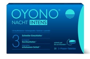 OYONO® ist besonders für seine innovativen 3-Phasen-Tabletten bekannt. Sie kombinieren verschiedene, ausgewählte Pflanzenextrakte mit dem körpereigenen Stoff Melatonin. Die Inhaltsstoffe werden nach der Einnahme zeitlich versetzt freigesetzt - sowohl zu Beginn als auch im Verlauf der Nacht - und unterstützen je nach Produkt bestimmte Aspekte des Schlafs. Schlafprobleme sind von Mensch zu Mensch sehr unterschiedlich. Der eine hat Schwierigkeiten beim Einschlafen, der andere leidet unter einem unruhigen, zu leichten und nicht erholsamen Schlaf. Auch das häufige Aufwachen in der Nacht, das einen erholsamen Schlaf verhindert, stellt für viele Betroffene ein großes Problem dar. Genau hier setzen die Produkte von OYONO® an. OYONO® NACHT INTENS unterstütz das Ein- und Durchschlafen, sowie einen erholsamen Schlaf.[1-3] Einschlafen, einen ruhigen Schlaf und eine normale Schlafqualität werden durch OYONO® NACHT unterstützt.[4-6]