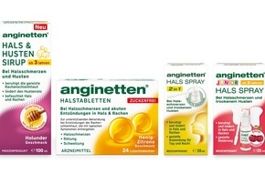 Seit 1965 steht anginetten® für bewährte Hilfe bei Halsschmerzen. Mit einem breiten Sortiment bietet anginetten® für jedes Bedürfnis eine passende Lösung: klassische Lutschtabletten in verschiedenen Geschmacksrichtungen, ein 2-in-1 Halsspray für Erwachsene bei Halsschmerzen und trockenem Husten, ein mildes Spray für Kinder mit angenehmen Kirschgeschmack sowie der neue Hals & Husten Sirup zur kombinierten Linderung von Halsschmerz und Husten.
