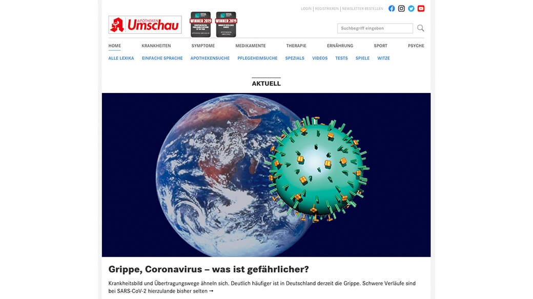 apotheken-umschau.de wurde 2019 zur "European Digital Publishing Platform of the Year" gekürt. Die Experten-Jury würdigte damals ausdrücklich die umfassenden lexikalischen Inhalte und das enzyklopädische Wissen zum Thema Gesundheit. "Die Kompetenz der Marke Apotheken Umschau liegt ganz klar in den Bereichen Gesundheit und Medizin, Prävention und Therapie - für diese Themen stehen wir wie kaum ein anderes Medium, denn wir sind in der Apotheke verwurzelt", so Dr. Dennis Ballwieser, Geschäftsführer des Wort & Bild Verlags. apotheken-umschau.de bietet als erstes deutschsprachiges Gesundheitsportal Inhalte in Einfacher Sprache, dadurch werden Gesundheitsinformationen noch leichter verständlich.