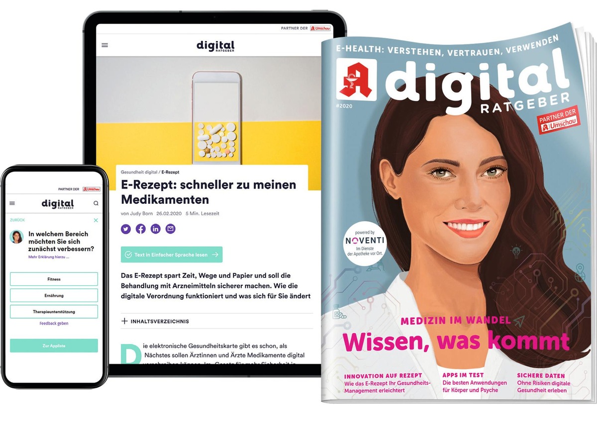 Das umfangreiche Online-Angebot www.digital-ratgeber.de informiert aktuell und seriös über Trends und Themen rund um Digital Health. Auf der Plattform finden User verständliche Antworten auf die wichtigsten Fragen rund um Digitalisierung in Gesundheit, Medizin und Apotheke. Ein neuer App-Finder unterstützt mit wenigen Klicks bei der Suche nach einer auf die individuellen Bedürfnisse zugeschnittenen Gesundheits-App. Zeitgleich startet der E-Health-Podcast "diagnose digital" auf allen öffentlichen Podcast-Plattformen.