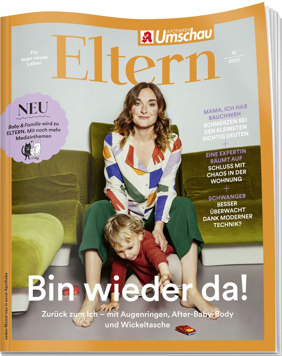 Ab 1. Oktober ist die neue ELTERN mit dem Titelthema "Bin wieder da!" kostenlos in Apotheken erhältlich. Mit noch mehr Gesundheitsschwerpunkten, einer Themenvielfalt von Diversität bis hin zu Nachhaltigkeit und neuer Struktur mit den festen Rubriken Gesundheit & Medizin, Familie, Schwangerschaft & Geburt sowie Ernährung. Das alles in moderner Optik und in hoher redaktioneller Qualität aus dem Hause Wort & Bild.