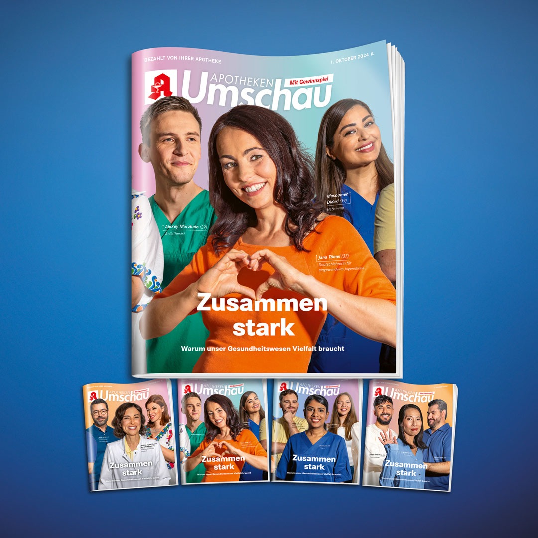 Vier verschiedene Titelbilder mit Menschen aus unterschiedlichen Ländern und unterschiedlichen Gesundheitsprofessionen zieren die Oktober-A-Ausgabe der Apotheken Umschau - aneinandergereiht ergibt sich ein bildstarker Hinweis darauf, wie vielfältig es im Gesundheitsmagazin dieses Mal zugeht: Die Ausgabe widmet sich komplett dem Thema Migration und Medizin, in seinen wichtigsten und zum Teil noch wenig beachteten Aspekten in Hinblick auf Zugewanderte und ihre Nachkommen in unserer Gesellschaft. "Zusammen stark - warum unser Gesundheitswesen Vielfalt braucht" lautet die Titelzeile.