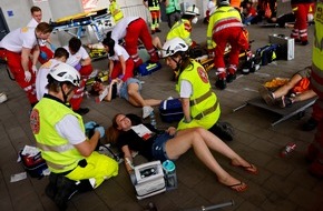 Der Arbeiter-Samariter-Bund (ASB) zieht eine positive Bilanz seiner bislang größten Bevölkerungsschutz-Übung am Samstag in Mainz, bei der mehr als 630 Einsatzkräfte für den Ernstfall übten. Das Szenario: nach einer Explosion in einer Imbissbude im Stadion des 1. FSV Mainz 05 müssen eine große Zahl (Schwer-)Verletzter und Betroffener gerettet, triagiert und versorgt sowie mit Rettungswagen in eine (fiktive) Klinik gebracht werden. Die verletzten Zuschauer:innen wurden von 140 Mimen realitätsnah dargestellt. Rettungshunde suchten nach Vermissten. Es waren 90 leicht bis schwer Verletzte zu versorgen, insgesamt kamen 160 Rettungsfahrzeuge des ASB zum Einsatz. Die Großübung fand bei hochsommerlichen Temperaturen von 35 Grad statt. Bereits am Freitag hatte in Worms eine Wasserrettungsübung mit 40 Einsatzkräften am Rhein stattgefunden.