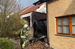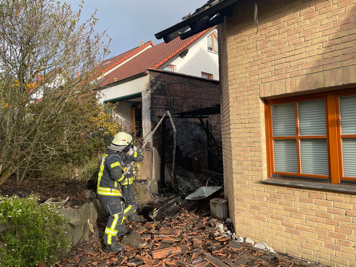 Datum: 09.04.2026/ Uhrzeit: 16:14 Uhr/ Dauer: ca. 5 Stunden/ Einsatzstelle: Wiesenstraße/ Einheiten: Löschzug Breckerfeld, Löschgruppe Delle, Löschgruppe Zurstraße/ Feuerwehren überörtlich: Ennepetal, Schwelm, Sprockhövel/ Rettungsdienst/ Polizei/ Bericht (rw/hb): Am Donnerstagnachmittag wurde die Feuerwehr Breckerfeld zu einem gemeldeten Garagenbrand in die Wiesenstraße alarmiert. Da bereits auf der Anfahrt eine massive Rauchsäule zu sehen war, wurde die Alarmstufe erhöht und weitere Einsatzkräfte zur Einsatzstelle nachgefordert. Bei Eintreffen der ersten Einsatzkräfte hatte das Feuer bereits vom in Vollbrand stehenden Carport auf das Wohnhaus übergegriffen. Dort standen ein Teil des Obergeschosses und des Daches bereits in Brand. Alle Personen waren vor Eintreffen der Rettungskräfte aus dem Gebäude raus und unverletzt. Durch den gezielten Löscheinsatz von außen und im Gebäude, sowie über die Drehleiter konnten schnell Löscherfolge erzielt und eine weitere Ausbreitung auf angrenzende Gebäude verhindert werden. Im Einsatzverlauf wurde ein Gecko aus dem Haus gerettet und den Besitzern übergeben. Das Dach musste über die Drehleiter mühsam geöffnet werden um alle Glutnester zu erreichen. Zusätzlich war es erforderlich das brennende Carport abzutragen und die Fassade des Hauses zu öffnen, um auch dort liegende Glutnester ablöschen zu können. Das Gebäude ist nach dem Brand nicht mehr bewohnbar. Neben den drei Einheiten der Feuerwehr Breckerfeld unterstützten die Feuerwehren aus den Städten Ennepetal und Schwelm an der Einsatzstelle, sowie die Feuerwehr Sprockhövel, welche den Brandschutz in Breckerfeld für eventuelle Paralleleinsätze sicherstellte. An dieser Stelle ein großes Dankeschön für die Unterstützung. Nach Abschluss der Maßnahmen wurde die Einsatzstelle an die Kriminalpolizei übergeben. Die Feuerwehr konnte diesen kräftezehrenden Einsatz mit Wiederherstellung der Einsatzbereitschaft nach etwa fünf Stunden beenden. Später am Abend fand nochmal eine Nachkontrolle der Einsatzstelle statt, welche ohne weitere Feststellungen beendet werden konnte. Hinweis für Redaktionen: Das beigefügte Bildmaterial darf unter der Quellenangabe "Foto: Feuerwehr Breckerfeld" honorarfrei für die Berichterstattung verwendet werden. Eine darüberhinausgehende Nutzung bedarf der schriftlichen Zustimmung.